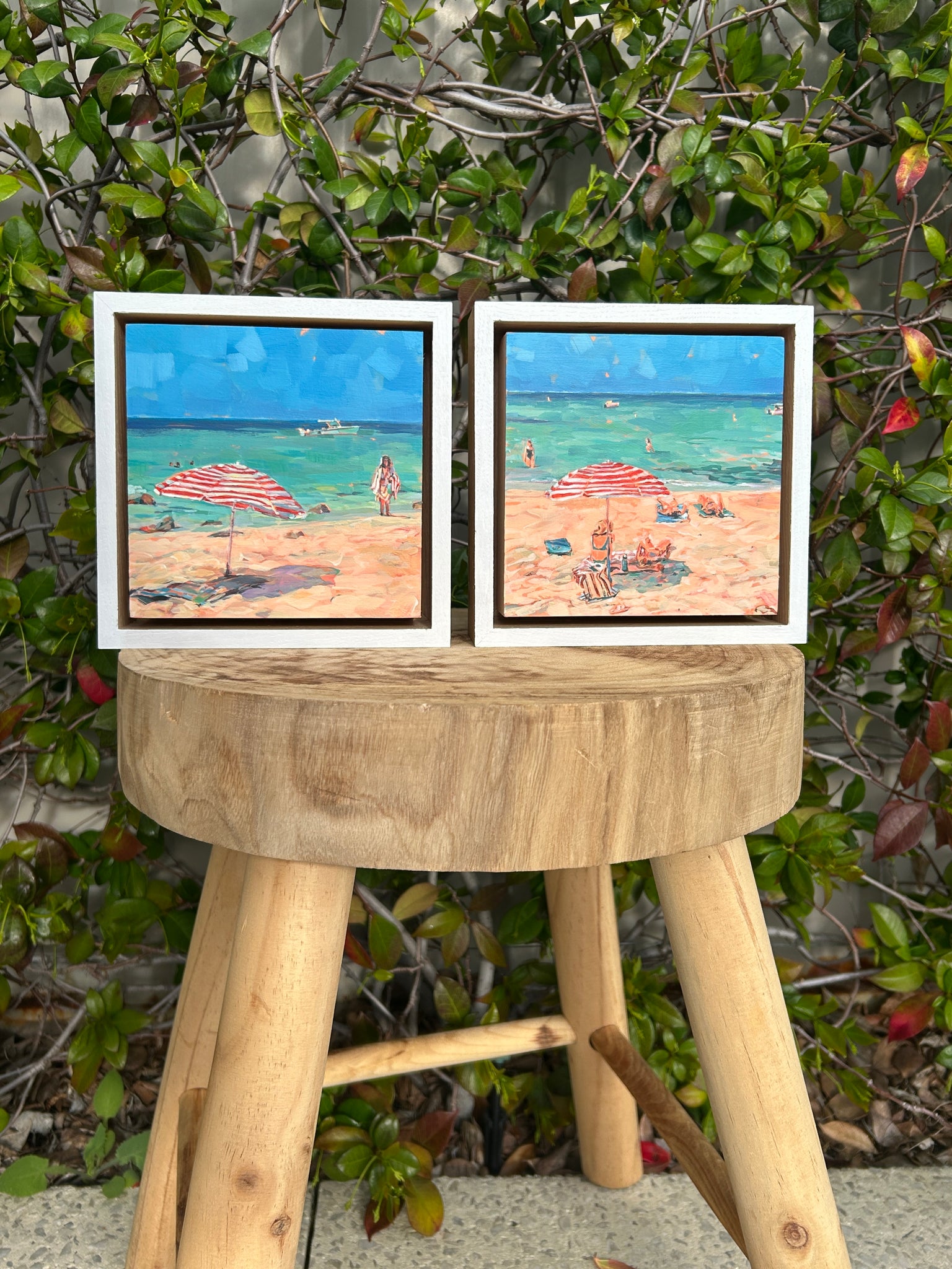 Original painting on board in a timber float frame with white facing trim. Sometimes a scene is just so pretty you have to paint it. I cannot resist a stripped brolly and this red one caught my eye against the turquoise waters.