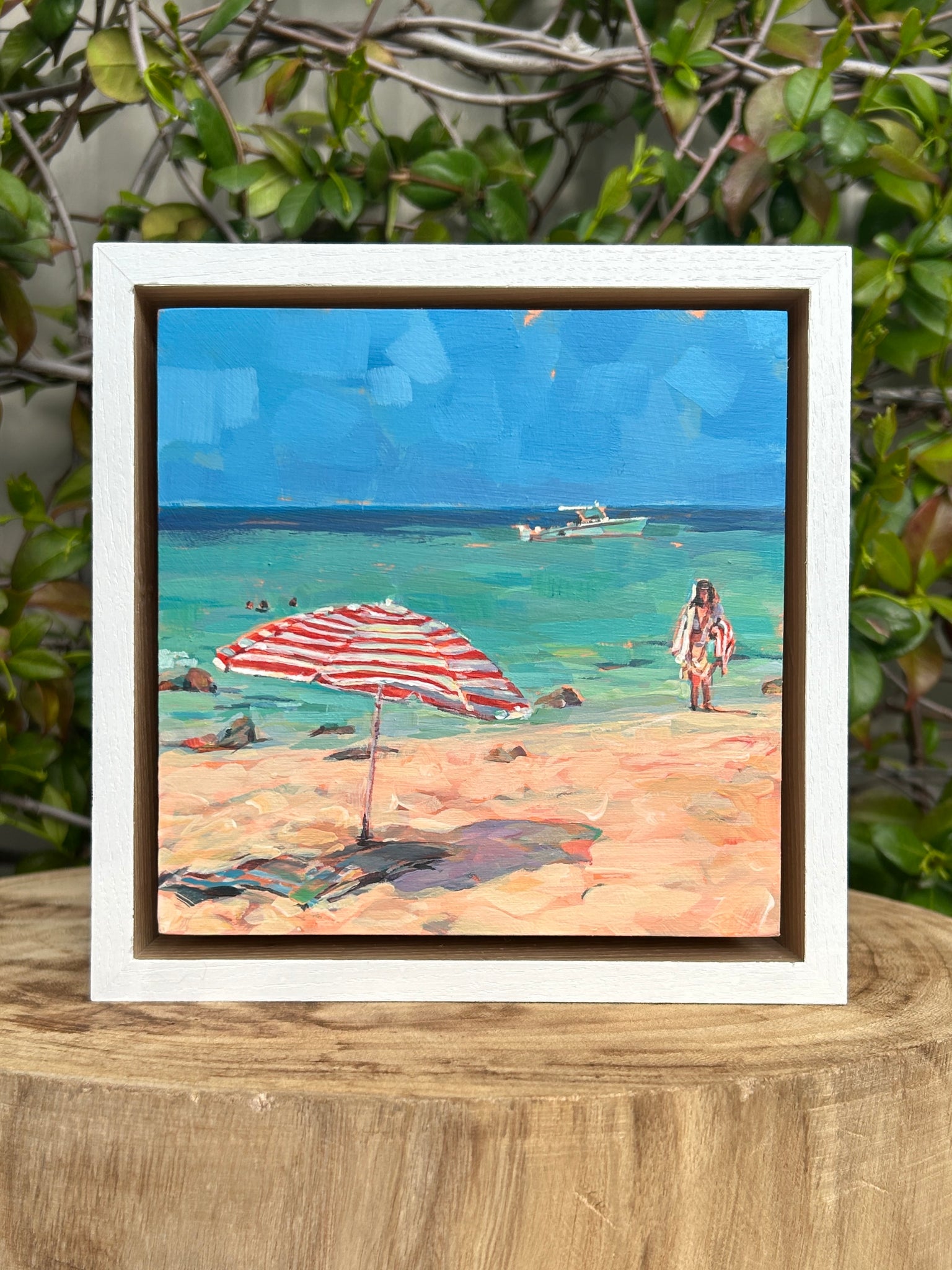 Original painting on board in a timber float frame with white facing trim. Sometimes a scene is just so pretty you have to paint it - twice! I cannot resist a stripped brolly and this red one caught my eye against the turquoise waters.