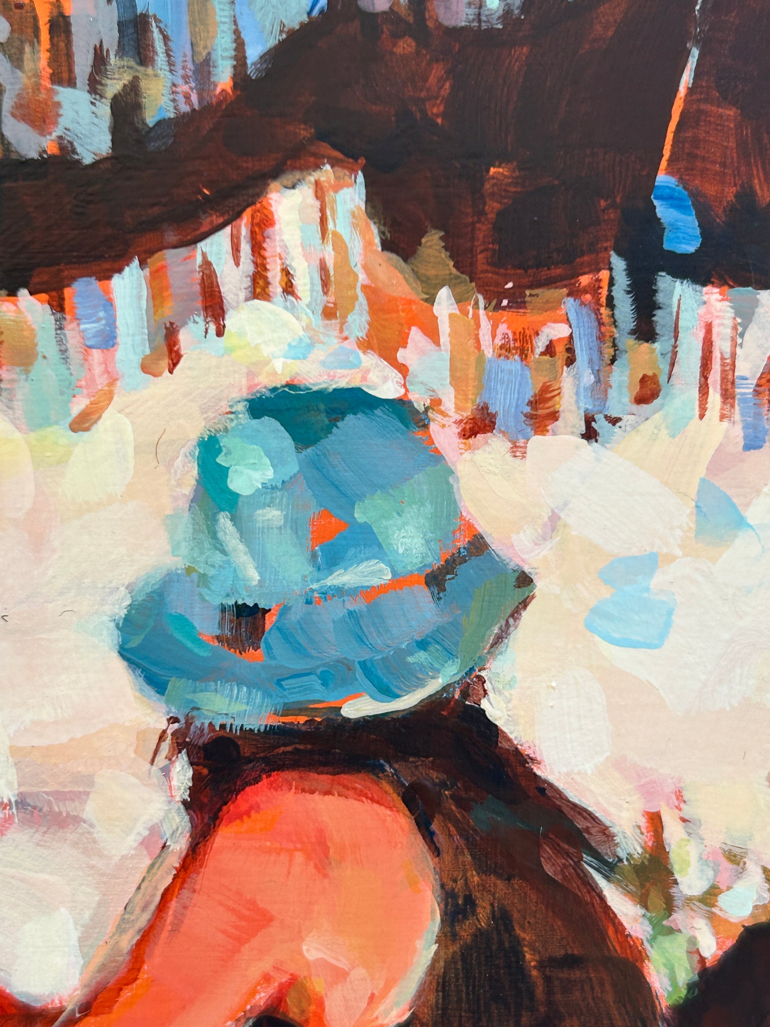 Original painting on board in a timber float frame with white facing trim. What can I say about this painting except I am in love with it! The brushwork, colours, subject matter, I could go on and will! It occurred to me the other day that the "brolly" in my paintings is a symbol for safety and protection. In this painting the brolly is a cocoon for young love.